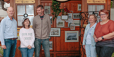 Wo einst die Busse fuhren, lässt sich jetzt zu Zeitreisen starten. Das neue Leben des alten Wartehäuschens in Martinsdorf, Gemeinde Gaweinstal. © Monika Bader 7. Juli 2022 A / NÖ: Martinsdorf: Eröffnung des Geschichte(n)-Kammerls Früher hielten hier die Linienbusse für die Fahrt zum Arbeitsplatz, jetzt kann man hier zu Zeitreisen starten. Nachdem die Busstation an eine andere Stelle verlegt wurde, überlegte sich Karin Griessbach eine neue Verwendung für das nunmehr funktionslos gewordene Wartehäuschen in Martinsdorf. Gemeinsam mit MitstreiterInnen aus der Gemeinde und der örtlichen Topothek wurde aus dem Verkehrsbauwerk ein Schmuckkästchen für Erinnerungen zur Geschichte der Ortschaft. Eine Auswahl alter Fotografien kann hier so manche Interessierte zum Verweilen anlocken und natürlich auf Appetit für mehr in der Topothek Gaweinstal anregen, deren Name sogar in Holz gebrannt ist. Die Eröffnung des Geschichte(n)-Kammerls: vlnr: Vizebürgermeister Johannes Berthold, Ideengeberin Karin Griessbach, Christian Berthold, Hermine Schreitl, Bürgermeisterin Birgit Boyer © Johann Pratsch Liebevoll und vielfältig gestaltet zeigen sich historische Blicke in die Vergangenheit von Martinsdorf. © Monika Bader Mit dem Veranstaltungsplakat des Projektes „Unsere Gemeinden anno dazumal“ der LEADER-Region Weinviertel-Ost, mit der die Topothek von Gaweinstal ihren Anfang nahm. © Monika Bader
