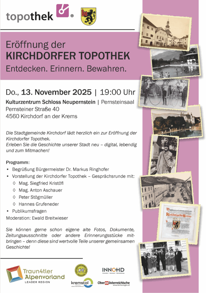 Die Bezirkshauptstadt des Bezirks Kirchdorf wird ab 13. November mit ihrer Topothek einen Rückblick in ihre Geschichte ermöglichen. Bürgermeister Markus Ringhofer sowie die Topothekarin und die Topothekare der Stadtgemeinde freuen sich auf zahlreichen Besuch des Eröffnungsabends. Ewald Breitwieser wird durch den Abend im Pernsteinsaal des Kulturzentrums Schloss Neupernstein, Pernsteiner Straße 40, 4560 Kirchdorf an der Krems führen.