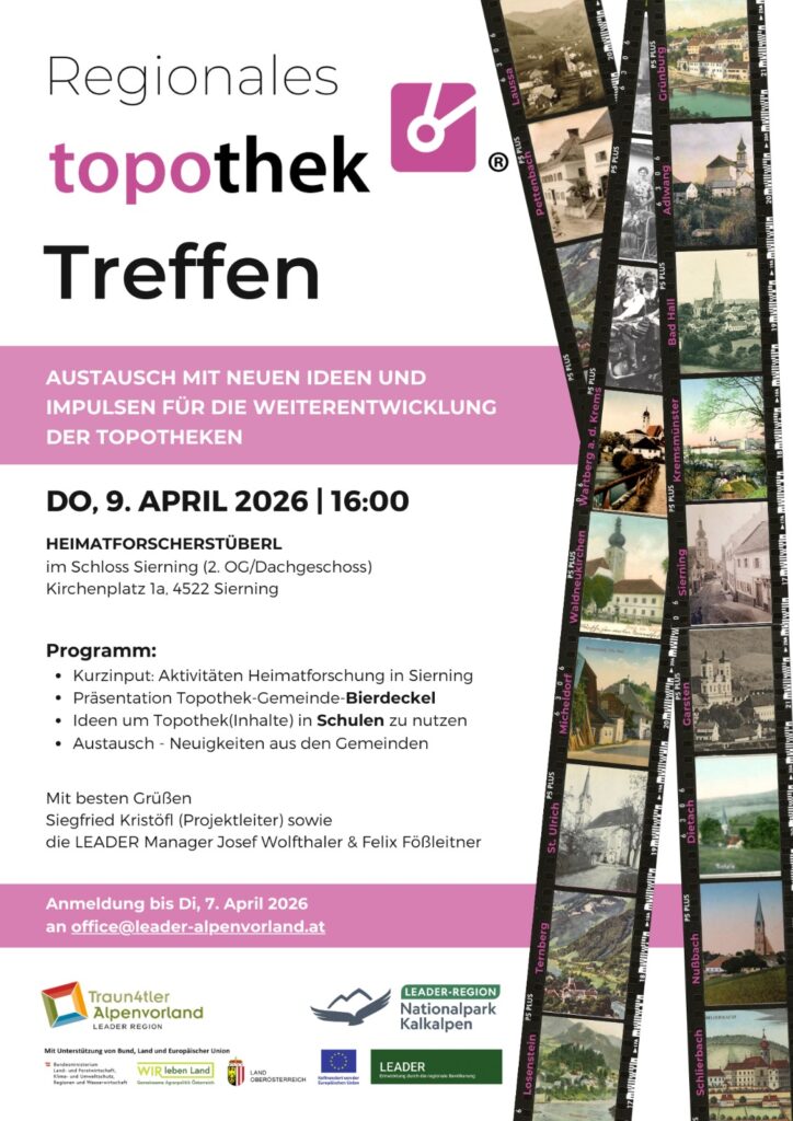 Am Donnerstag, den 9 April wird ab 16:00 im Heimatforscherstüberl des Schloss Sierning, Kirchenplatz 1a, 4522 Sierning, zum regen Austausch zu neuen Ideen und Impulsen zur Weiterentwicklung der Topotheken in der Region eingeladen.