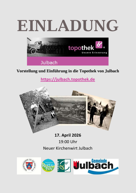 15. April 2026 17. April, 19:00 Uhr D/Bayern: Julbach: Topothek-Eröffnung Vorstellung und Einführung in die Topothek von Julbach. Ort: Neuer Kirchenwirt, Kirchenplatz 4, D-84387 Julbach Beginn: 19:00 Uhr Eintritt frei