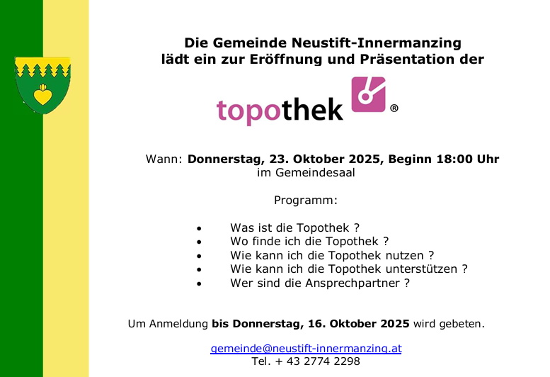 Die Topotheken wachsen in Inhalt und Anzahl und damit auch die Gruppe der Topothekarinnen und Topothekare. Dies bedeutet, dass in Zukunft mehr Fragen über die Arbeit und zu Tipps und Tricks auftreten werden. Um dem Sorge zu tragen, richten wir eine zeitlich fixierte „Anlaufstelle“ für Sie ein, in der wir uns regelmäßig und formlos treffen können. Künftig findet jeden Mittwoch von 16:30 bis 17:30 ein Topotheken – Jour fixe über Zoom statt. Dazu laden wir Sie herzlich ein!