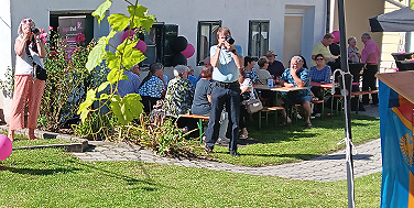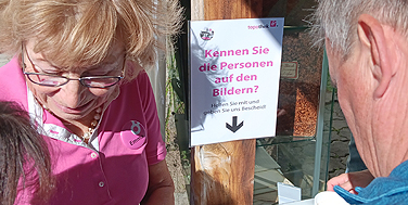 Under a cloudless sky, the opening of the Topotheque was celebrated in the Drasenhofen rectory garden. Between the rectory, vines, and the old press house, all those who still had stories to tell about Drasenhofen‘s past or who wanted to learn more gathered. The hosts, Mayor Horst Frank and Pastor Richard Hansl, who opened the rectory garden for the event, welcomed state parliament member Manfred Schulz, who emphasized the value of preserving Weinviertel traditions. After a brief explanation by Alexander Schatek about the nature of the Topotheque, Andrea Calvin, the initiator of the Drasenhofen Topotheque and head of the local Topotheque team, invited guests to visit the various stations in the lovingly decorated garden. In the shade of the pergola, a screen was available to answer specific questions online. Detailed wall panels vividly juxtaposed various historical topics of the community. In the darkness of the old press house, there was a much-noticed video loop featuring Super-8 footage from the 1970s. While the festival was present, little is known about the festival of the past celebrated on this cover image. But that, too, is one of the Topotheque‘s functions: to capture knowledge about it.