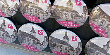A round thing number 2: Badges so that the web address ist remembered. © Tanja Strobl, Foto: Schatek