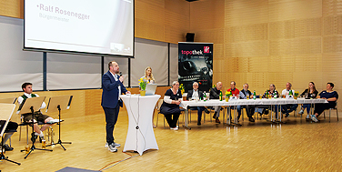 Mayor Ralf Rosenegger opens the Aschach an der Steyr Topotheque in front of the asemled team. © Leopold Ziebermayr